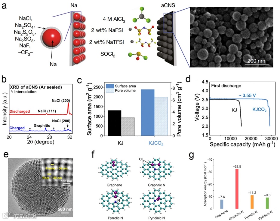 一系列碳材料被首先探究作为电池的正极材料。研究表明,碳材料的孔容对于首圈放电的比容量至关重要,更大的孔隙率对应于可容纳更多的MCl,从而有利于SOCl2的充分还原。在另一方面,孔的分布和种类对后续的循环稳定性有重要影响,微孔孔隙率大的碳材料对于Cl2有更好的限制作用,从而展现出更好的可逆性。此外,还可通过CO2活化等方法来增加碳材料的缺陷或者杂原子掺杂,进一步提升电化学性能。