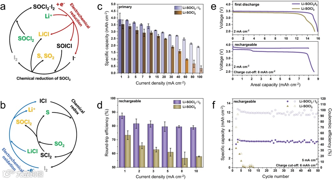 可充电AM-Cl2 电池实际上是在Li-SOCl2 原电池的基础上开发出来的。实际上,完全基于 Li+/Li 和 Cl2/Cl- 氧化还原对的Li-Cl2电池理论能量密度更高。不依赖 SOCl2 而实现可逆的氯氧化还原反应将进一步提高下一代电池的能量密度,同时消除硫相关物种对反应机制和负极稳定性研究的干扰。