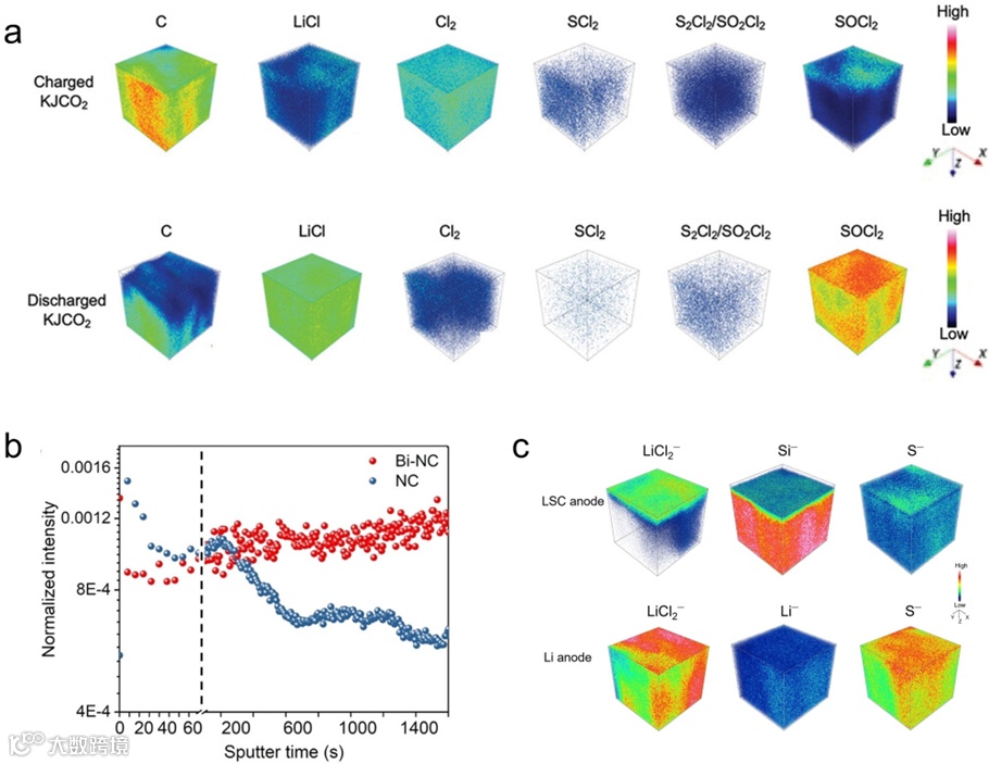 图15 TOF-SIMS用于AM-Cl2电池正负极的深度剖析和物种确定。