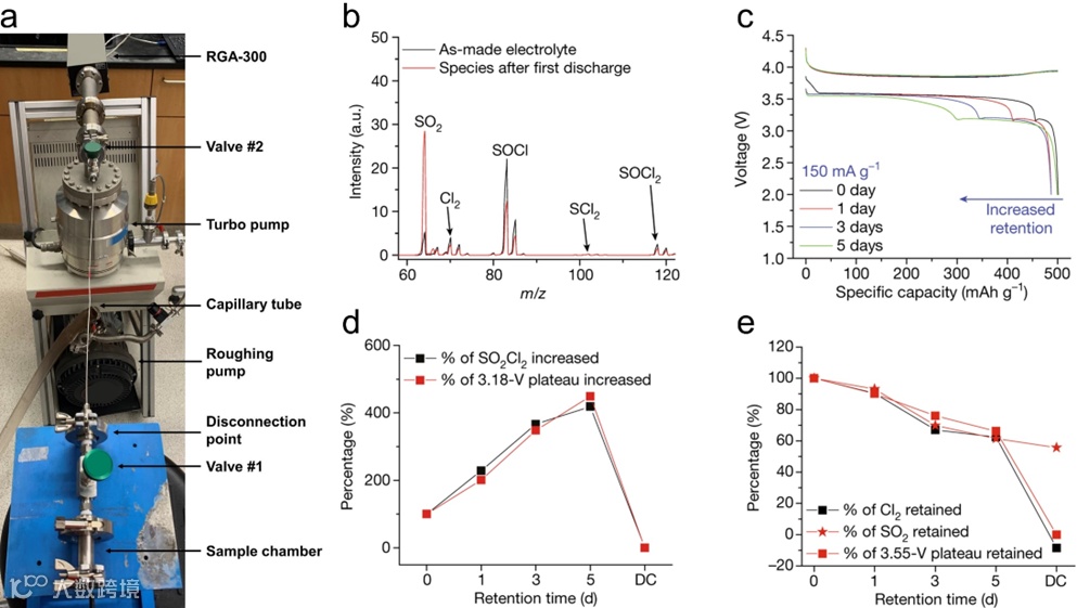 如图 4a 所示,AM-SOCl2 一次电池和可充电AM-Cl2AM-Cl2电池都由相似的组件组成,即碱金属负极、多孔结构的正极和溶于 SOCl2 电解液的四氯铝酸金属盐(MAlCl4)或 AlCl3 电解液。首次放电时,碱金属会与SOCl2 发生反应,生成MCl 钝化层,从而抑制进一步的反应。当电解液中的 AlCl3 消耗殆尽或起始电解液为中性的 MAlCl4 溶液时,SOCl2 将还原为 S、SO2 和 MCl,这相当于第二个放电平台(图 4b)。生成的大量 MCl沉积在多孔正极上,形成钝化层终止放电,这也为电池的可充电性奠定了基础。充电时,当电压达到析氯电位时,MCl 被氧化成 Cl2,相当于第一个长充电平台。随后会出现另一个更高的充电平台。这可能是由于SOCl2 进一步氧化成 Cl2,以及在初始放电过程中产生的大量 Cl2 与硫元素之间的反应生成了其他氧化产物,包括 SO2Cl2、SCl2 和 S2Cl2。在放电过程中,这些产物会再次还原成S和MCl沉积在正极上。如图 4c 所示,主要的放电平台(~3.6 V)主要归因于氯还原反应,而SO2Cl2 的还原由于其氧化还原电位略低于其他产物,因此放电平台较低(约 3.3 V)。从图 4c 中可以明显看出,随后的可逆充放电循环中,MCl 和 Cl2 之间的转化反应贡献了大部分的可逆容量。因此,将此电池称为可充电 AM-Cl2 电池更为准确。