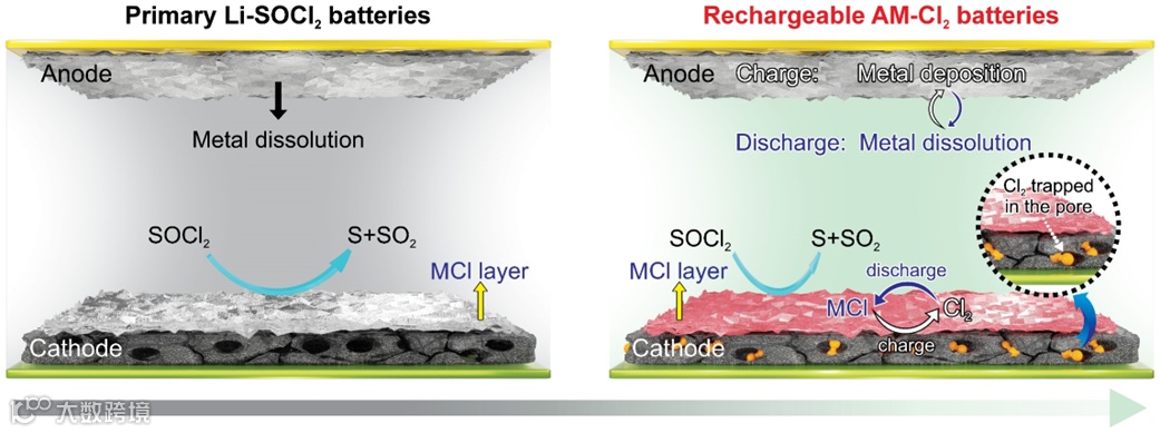 图2 Li-SOCl2一次电池与可充电 AM-Cl2 电池反应机制的比较。