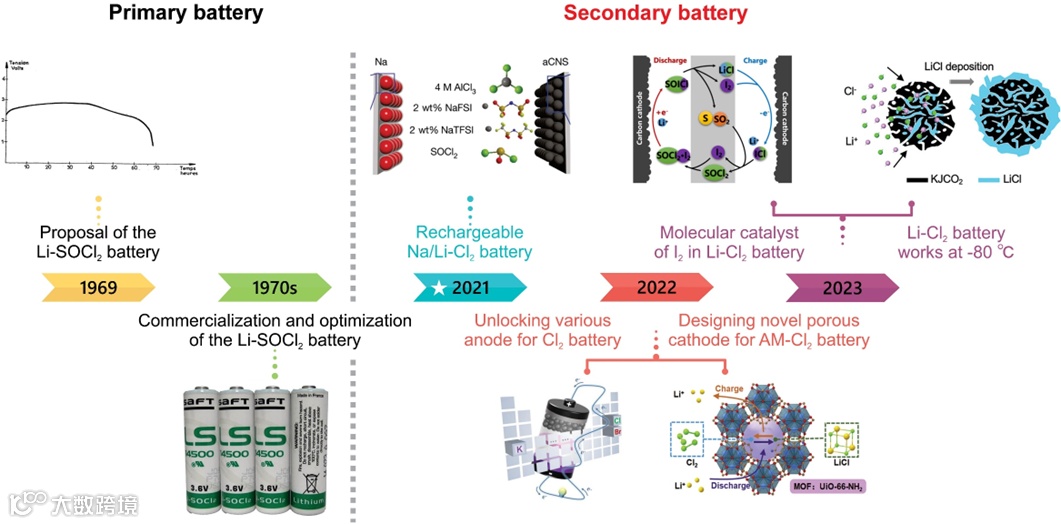 图3 由Li-SOCl2 一次电池转变为AM-Cl2二次电池的发展历程。