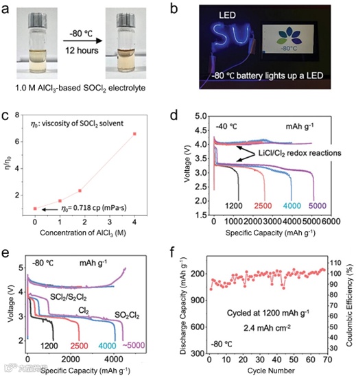 SOCl2 固有的低凝固点(-105 °C)使得 AM-Cl2 电池的低温运行成为可能。溶质浓度对低温下的高电导率电解质起着至关重要的作用。实验结果表明,在室温下,随着 AlCl3 的加入,电解质的电导率最初呈上升趋势,随后有所下降。然而,在零度以下,电导率与AlCl3 的浓度完全呈负相关。因此,采用低浓AlCl3 电解液有助于电池的低温性能。采用基于1 M AlCl3 的电解液可在-80 °C的超低温下工作,同时可实现比室温下更高的充放电比容量。