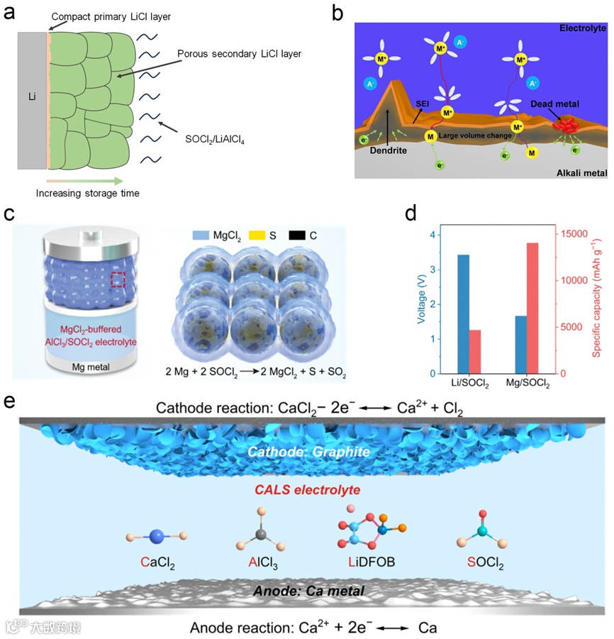 在研究的初级阶段,研究人员探索了无机磷/硫氧卤化物作为锂负极电池兼容电解质的可能性。然而,传统锂盐在这些溶剂中的溶解度很差。相反,路易斯酸在这些氧卤化物中具有高溶解度,其强大的配位效应可能有助于锂盐的解离。后来证实,LiCl 和路易斯酸 AlCl3 可以形成中和的 LiAlCl4,电解液表现出高离子电导率。研究还发现,SOCl2 本身可发生还原反应,释放出超凡的容量。以 LiAlCl4为基础的电解液已成为Li-SOCl2 一次电池和可充电 AM-Cl2 电池的通用电解质。然而,电化学过程中产生的氯化物钝化层,以及SOCl2还原,MCl/Cl2转化等步骤的反应动力学缓慢,严重限制了电池的倍率性能。研究人员通过调控钝化层生长和引入催化型添加剂成功对电池的性能进行优化。