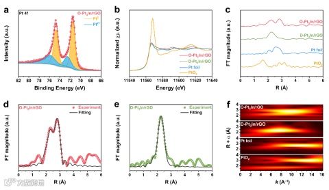 从XPS(图2a)可知,O-Pt3In/rGO中Pt是以金属形式存在,随后的XAS测试结果也支持了这一结论。EXAFS精细谱表明,O-Pt3InrGO具有明显异于D-Pt3In/rGO以及Pt foil的精细结构,这一现象可能归因于原子排布的有序以及合金化作用,这为接下来碱性HOR测试结果性能的差异埋下了伏笔。