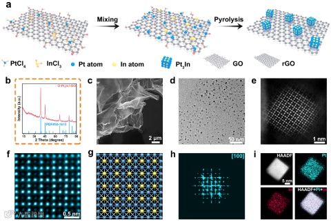 本文通过简便的浸渍以及高温H2退火制备出了rGO负载的有序金属间化合物Pt3In(O-Pt3In/rGO)(图1a)。XRD图谱中的超晶格衍射峰意味着有序结构的形成(图1b)。SEM,TEM以及AC-TEM展示了催化剂的形貌以及微观尺度的原子排列,证明有序结构的形成。(图1c-i)。