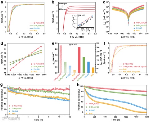 在H2饱和0.1 M KOH溶液中测试了不同催化剂的碱性HOR性能,其中O-Pt3In/rGO具有最快的碱性HOR动力学。(图3a)。不仅如此,其还具有最大的动力学电流密度以及交换电流密度(图3b-d);在归一化至Pt负载后,O-Pt3In/rGO也远超D-Pt3In/rGO,Pt/rGO以及Pt/C(图3e)。另外,O-Pt3In/rGO还表现更好循环耐久性(图3f, g)以及抗CO毒化能力(图3h)。