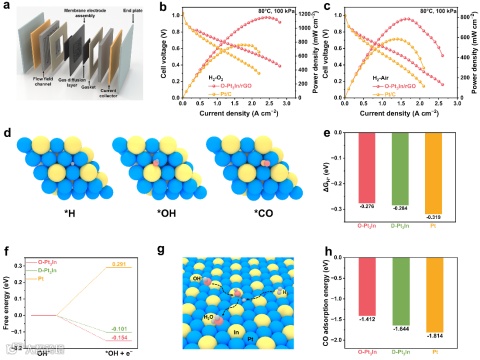 图4 O-Pt3In/rGO的碱性氢氧燃料电池性能以及DFT理论计算结果。