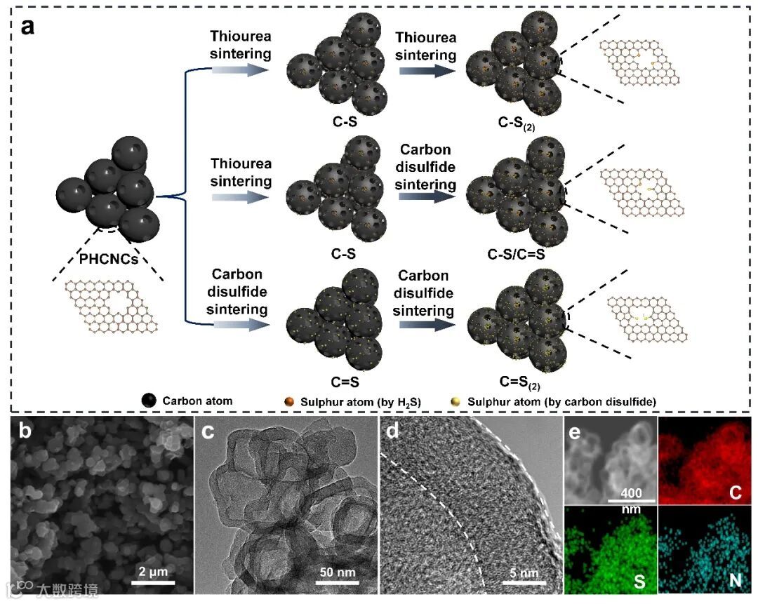 在本研究中,通过不同硫掺杂剂的特殊二次硫化处理,实现了碳骨架中协同碳硫键的结构设计。因此,设计并合成了具有协同掺杂碳硫键(C-S/C=S)的多孔中空碳纳米笼。