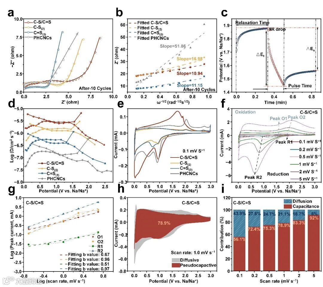 图4. (a) 10个循环后的C-S/C=S、C-S(2)、C=S(2)和PHCNCs的奈奎斯特图和(b)低频区的相关线性拟合。(c) ,(d) GITT测试计算离子扩散系数以及电压情况。(e) C-S/C=S、C-S(2)、C=S(2)和PHCNC在0.1 mV s−1扫描速率下的首条CV曲线。(f) ,(g)从0.1到5.0 mV S−1的C-S/C=S的CV结果,通过峰值电流和扫描速率计算确定的b值。(h) C-S/C=S在1.0 mV s−1时的赝电容和扩散贡献。(i)不同扫描速率下C-S/C=S对电容和扩散的归一化贡献。