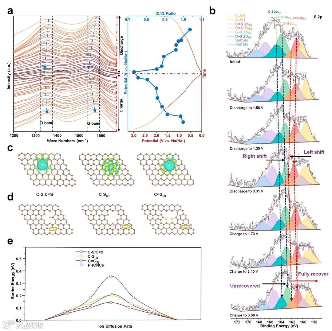 图5. (a) C-S/C=S的原位拉曼光谱和相应电势的电化学曲线(第二次电化学循环)以及相应电势的ID/IG值。(b) 对C-S/C=S、C-S(2)、C=S(2)和PHCNCs的差分电荷密度进行了模拟研究,黄色是电子积累区,青色是电子损失区。(d) 三个模型的钠离子扩散路径的理论模拟。(e) 沿着C-S/C=S、C-S(2)、C=S(2)和PHCNCs的离子扩散路径的钠离子扩散能垒的理论模拟。