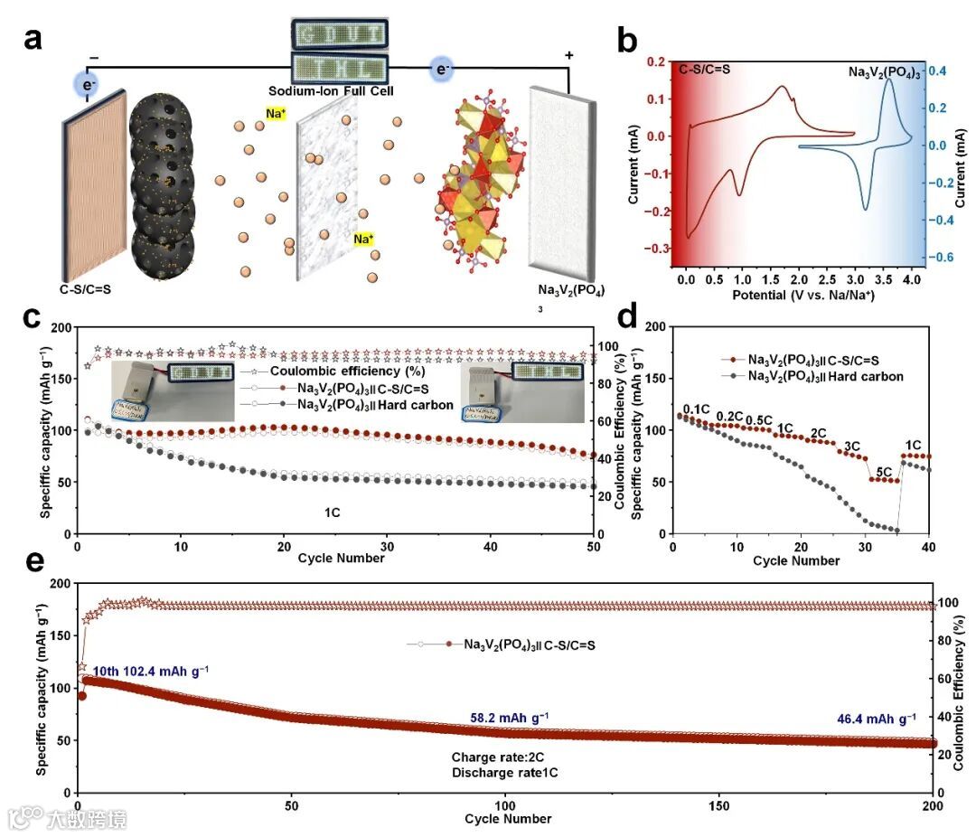 为了进一步评价C-S/C=S作为SIBs负极在实际应用中的电化学性能,将其与Na3V2(PO4)3正极配对,组装了全电池。全电池表现出优异的性能,并成功地为发光二极管供电。
