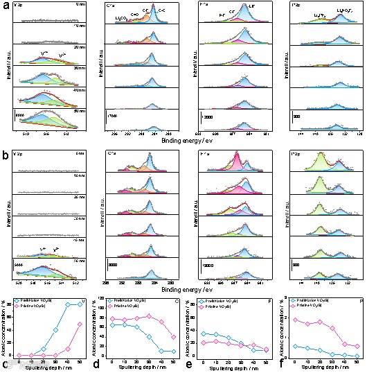 图6. 在1.0 A g-1条件下进行500次循环后,(a) 预锂化和(b) 原始VO2(B)电极的V 2p、C 1s、F 1s和P 2p的XPS溅射光谱。循环电极上的(c) V、(d) C、(e) F和(f) P元素的原子浓度。