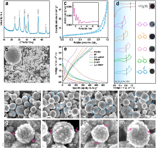 图2. VO2(B)微球(a) XRD;(b) FEEM图像;(c) N2吸附/解吸等温线和孔径分布;(d)在1.0 mol L-1 LiPF6 THF中的Li-BP衍生物的循环伏安图和浸入Li-BP衍生物/THF体系中10 minVO2(B)电极SEM图;(e)设计的Li-BP衍生物/THF试剂对VO2(B)电极可逆容量的影响。用Li-2-C-4-MBP/THF试剂(f,g) 5 min;(h,i) 10 min;(j,k)15 min预处理后的VO2(B)电极FESEM图像。