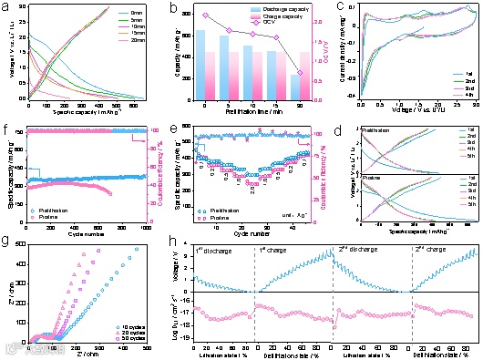 图3 a为不同预锂时间下VO2(B)电极的初始充放电曲线。预锂化时间增加到15分钟后,VO2(B)电极的ICE达到约98%,表明预处理有效地消除了初始不可逆容量。预锂化和原始VO2(B)电极的CV曲线证实了这一结论(图3 c,S7a)。为了进一步阐明预锂的性能优势,我们对预锂15 min的VO2(B)电极进行了全面的表征,并与原始电极进行了比较。(如果没有规定,在后续讨论中VO2(B)电极的预锂化时间默认为15 min)从倍率循环数据(图3 e,)可以看出预处理后循环稳定性增强。为了了解其优越的电化学性能,收集了不同循环后预锂电极的EIS和GITT数据。从图3 g和图S7 b可以看出,预锂化后电极的欧姆电阻和电荷转移电阻(Rsf+ct)之和随循环周期的增加而逐渐减小,这与其循环能力的温和增加相一致。此外,根据恒流间歇滴定技术(GITT)曲线(图3 g)计算出,预锂化电极的锂离子扩散系数在3.53×10-18和1.56×10-17cm2s-1之间,略高于原始的VO2(B)。(图S11),证实了预锂化电极优越的倍率性能。
