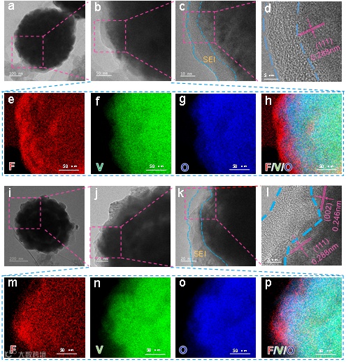 另外,预锂化(图5 b)和原始(图5 j)VO2(B)微球指定区域的HAADF-STEM元素映射分别见图5 e-h和图5 m-p。值得注意的是,预锂化电极表面的F元素信号更强、更均匀,这与高含量氟化锂组分的均匀涂层相一致。相反,F元素在原始VO2(B)微球表面的分布不均匀,说明SEI层的厚度不均匀。由此观察可以推断,预锂化后在电极表面生长的SEI层有效地抑制了电解质侧反应,并具有较高的结构强度,减缓了循环过程中SEI层的修复和生长。然而,与电解质直接接触的原始电极,由于体积效应和溶解,SEI层持续修复和生长,导致SEI层不均匀、较厚。这也部分解释了从图3中观察到的循环稳定性和EIS结果。