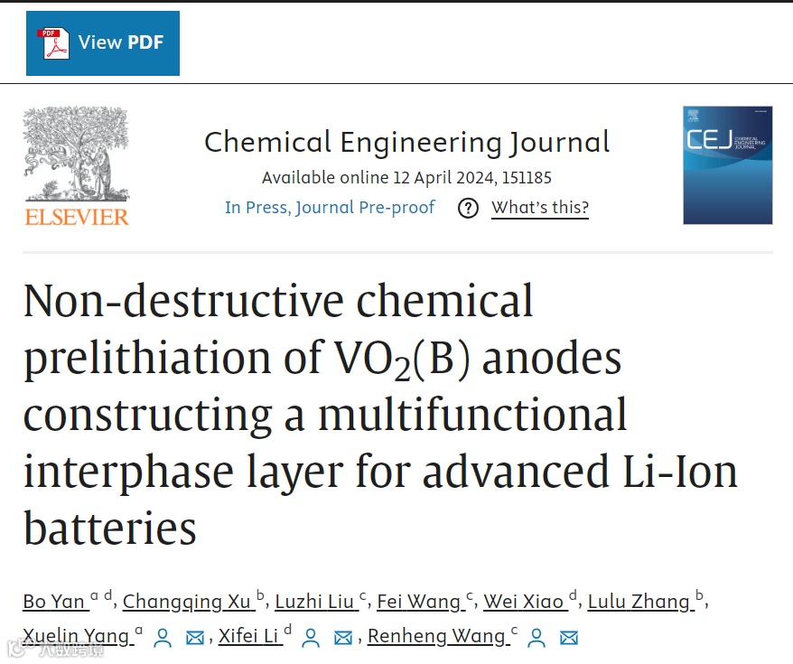 近日,三峡大学杨学林教授联合西安理工大学李喜飞教授和深圳大学王任衡研究员,在国际顶级期刊Chemical Engineering Journal (影响因子:15.1) 上发表题为“Non-destructive Chemical Prelithiation of VO2(B) Anodes Constructing a Multifunctional Interphase Layer for Advanced Li-Ion Batteries”的研究成果。通过无损化学预锂化使VO2(B)负极达到接近100%的首次库仑效率(ICE)。通过各种表征方法,系统地研究了在预锂化和原始的VO2(B)电极上形成的SEI层的化学成分、厚度、均匀性和稳定性。结果表明,预锂化VO2(B)电极SEI层更薄且更加均匀,同时富含氟化锂组分和更少的不良副反应分解产物。特别是,随着循环进行,预锂化VO2(B)电极SEI层展现出更缓慢的生长速率,并具有更佳的稳定性。最后,作为一个概念性展示,该负极与商用NCM811正极构成了全电池。结果表明,在0.5 A g-1电流密度下,该电池循环1000圈后容量仍保持161 mAh g-1,同时能量密度提升近30%。