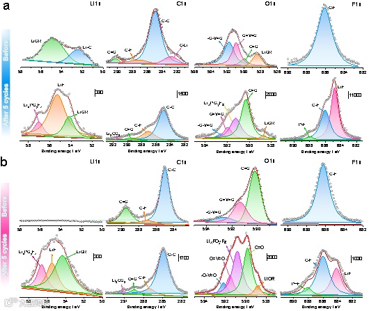 图4. (a)预锂化和(b)原始VO2(B)电极在5个循环前后的Li 1s、C 1s、O 1s和F 1s的高分辨率XPS光谱。