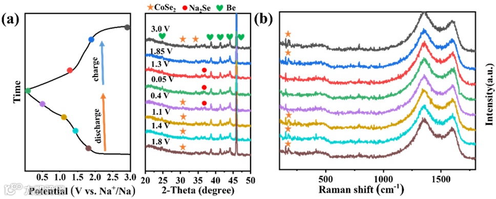 图8. 钠化和脱钠作用下的结构演化。(a) CoSe2/C-0.3@CNFs电极在100 mA/g首次循环时的原位XRD曲线和相应的充放电曲线图;(b) CoSe2/C-0.3@CNFs电极在100 mA/g充放电过程中的原位拉曼光谱图。