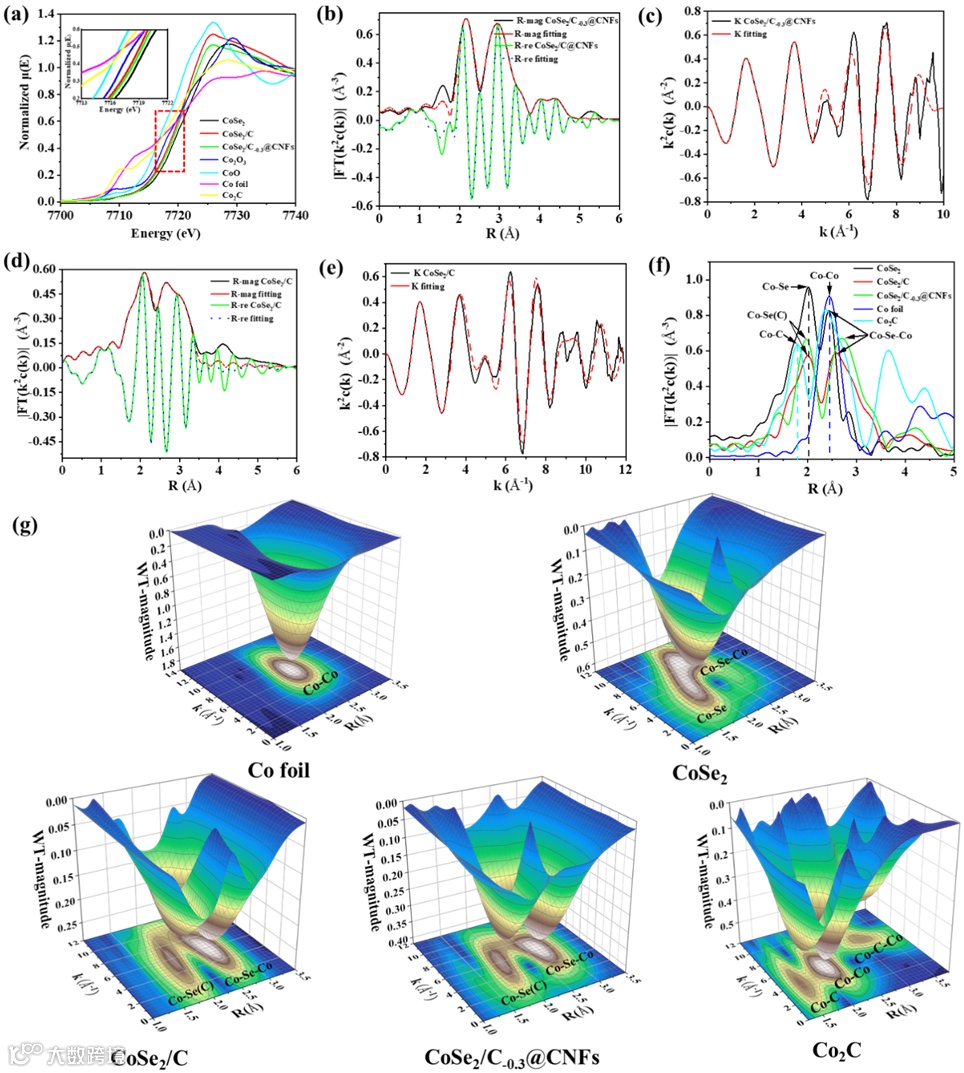 图5. (a) CoSe2/C-0.3@CNFs的Co k边XANES谱图;CoSe2/C-0.3@CNFs 中 Co 的 (b)χ(R) 和(c)χ(k) 空间光谱拟合曲线;CoSe2/C 中 Co 的 (d)χ(R) 和(e)χ(k) 空间光谱拟合曲线;(f) 样品的Co k边k2加权傅里叶变换谱;(g)分别为 Co 箔、CoSe2、CoSe2/C、CoSe2/C-0.3@CNFs 和 Co2C 的 Co 的 χ(k) WT。