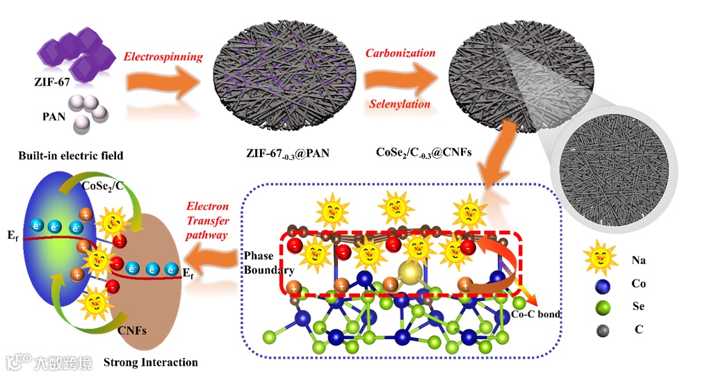 与锂离子电池相比,钠离子电池具有更高的安全性和相对丰富的钠储量,因此被认为是非常有吸引力的下一代储能器件。然而,半径较大的Na+ (0.102 nm),由于Na+ 的嵌入/脱出困难,导致动力学缓慢,容量衰减和循环稳定性较差,阻碍其实际应用。本篇观点展示了通过在双碳保护的二硒化钴阳极构建界面化学键(Co-C)以及内建电场,提高了电极的结构稳定性和电荷转移/离子扩散动力学。最佳CoSe2/C-0.3@CNFs阳极在5 A g-1时仍保持269.5 mAh g-1的放电容量。循环2600次后,在1.0 A g-1下的可逆容量为247.6 mAh g-1,表现出优异的循环稳定性。该研究为构建具有强化学键和内置电场特性的异质结构复合材料提供了有效的方法,用于高倍率性能和长周期稳定性的钠离子电池。