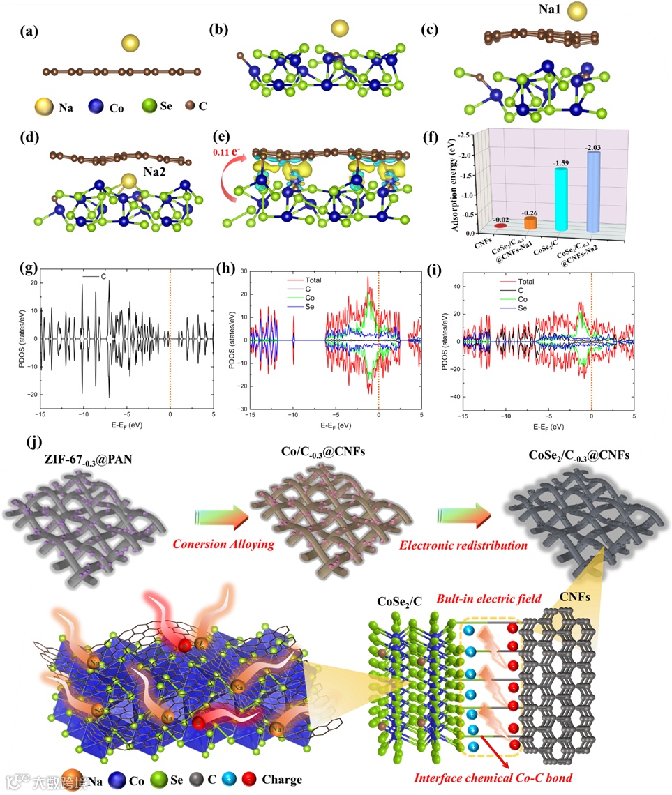 图6. (a,b) CNFs和CoSe2/C的优化结构模型;(c) 具有Na1原子吸附位点的CoSe2/C-0.3@CNFs的优化结构模型;(d) 具有Na2原子吸附位点的CoSe2/C-0.3@CNFs的优化结构模型;(e) CoSe2/C-0.3@CNFs的差分电荷密度图;(f) CNFs、CoSe2/C和CoSe2/C-0.3CoSe2/C-0.3@CNFs的Na+ 离子吸附能;(g-i) CNFs、CoSe2/C和CCoSe2/C-0.3@CNFs的部分态密度图;(j) 具有内置电场和相界的CoSe2/C-0.3@CNFs材料的机理图。