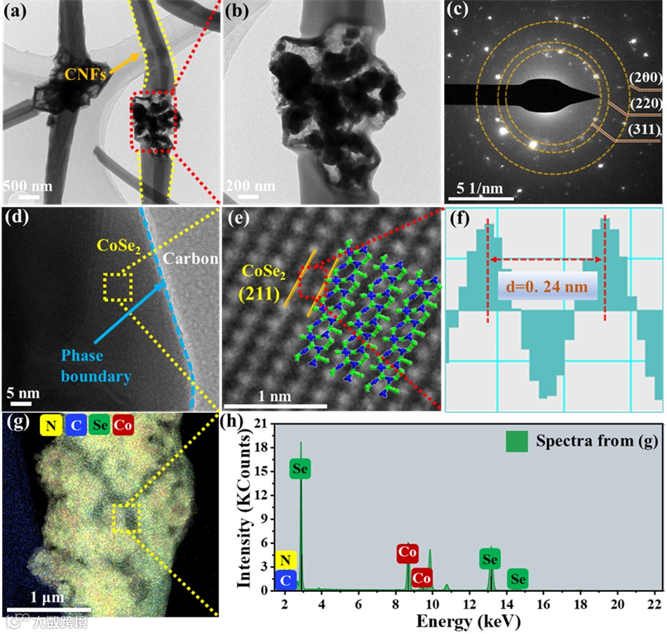 图3. (a, b)CoSe2/C-0.3@CNFs在不同倍率下的TEM图;(c) CoSe2/C-0.3@CNFs的SAED和 (d) HRTEM图;(e) CoSe2/C-0.3@CNFs的HRTEM和 (f) 放大后的HRTEM图;(g) CoSe2/C-0.3@CNFs样品的元素映射图像和(h)能量色散X射线能谱(EDS)。