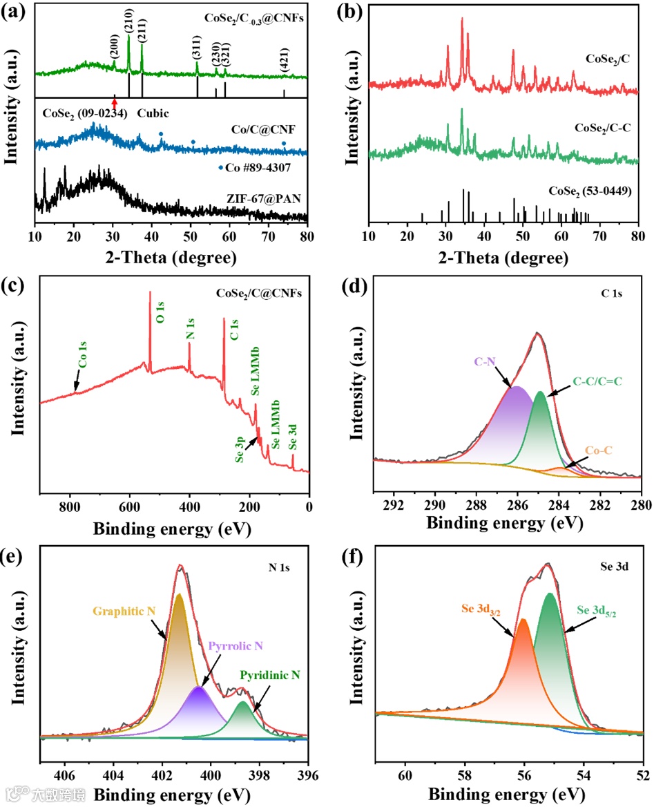 图4. (a) CoSe2/C-0.3@CNFs, Co/C@CNFs和ZIF-67@PAN样品的XRD图;(b) CoSe2/C和CoSe2/C-C复合材料的XRD图;(c) CoSe2/C-0.3@CNFs复合材料的XPS观测谱;CoSe2/C-0.3@CNFs样品的 (d) C 1s, (e) N 1s和 (f) Se 3d的高分辨率XPS光谱。