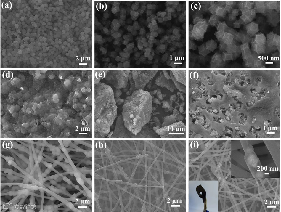 图2. (a) ZIF-67, (b) Co/C, (C) CoSe2/C, (d) ZIF-67-PAN (ZIF-67质量为0.3 g), (e) Co/C-C, (f) CoSe2/C-C的SEM图;(g) ZIF-67-0.3@PAN,(h) Co/C-0.3@CNFs,和 (i) CoSe2/C-0.3@CNFs样品的SEM图。