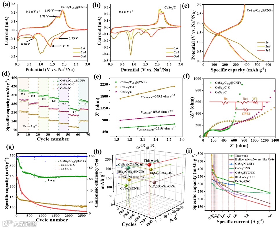 图7. (a, b) CoSe2/C-0.3@CNFs和CoSe2/C电极在0.1 mV/s下的初始三圈CV曲线图;(c) CoSe2/C-0.3@CNFs阳极的充放电曲线图;(d) CoSe2/C-0.3@CNFs, CoSe2/C-C和CoSe2/C阳极在为0.1-5 A/g电流密度范围下的倍率性能图;(e) CoSe2/C-0.3@CNFs、CoSe2/CC和CoSe2/C电极的Z′-ω-1/2图;(f) CoSe2/C-0.3@CNFs、CoSe2/C和CoSe2/C-C电极的EIS数据和相应的ZView拟合曲线图;(g)CoSe2/C-0.3@CNFs、CoSe2/C和CoSe2/C-C阳极的循环性能图;(h) 与其他过渡金属硒化阳极的循环稳定性对比图;(i) CoSe2/C-0.3@CNFs电极与先前工作报道的基于CoSe2基SIBs电极的倍率性能对比图。