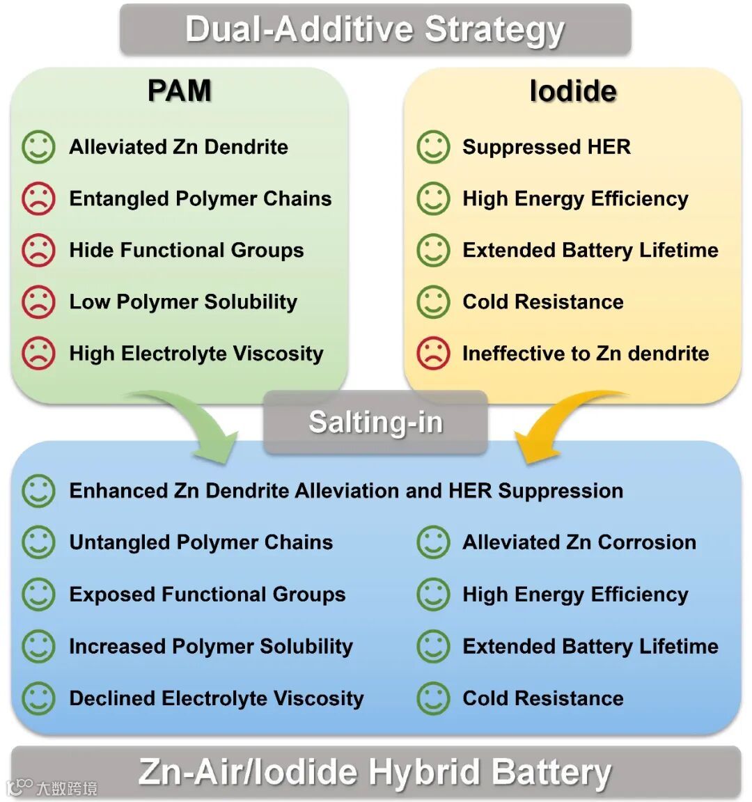 引入电解质添加剂简单易行,有望解决这些问题并提高电池性能。在提高电池能量效率方面,可以引入具有较低氧化电位的离液阴离子I-,以在充电过程中以更快的碘化物氧化反应(IOR)代替缓慢的析氧反应(OER),降低充电电压,提高能量效率。然而,I-对抑制锌枝晶生长作用有限。在解决锌枝晶问题方面,具有丰富极性官能团的聚丙烯酰胺(PAM)添加剂理论上可以诱导均匀的锌沉积,并与水分子相互作用以降低水的活性,但由于其溶解度低,在实际应用中效果有限。此外,PAM也无法提升锌空气电池的能量效率。总的来说,这两种添加剂优势明显但却都存在着缺陷。