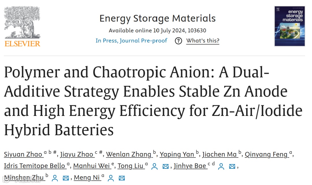 聚合物与离液阴离子:双添加剂策略助力锌空气/碘混合电池实现高能量效率与稳定锌负极