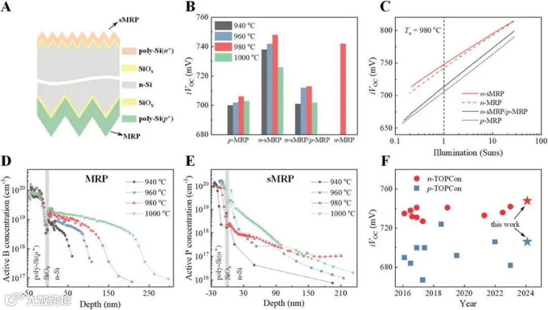 与平面表面相比,绒面的引入会增加表面的缺陷态密度进而降低表面钝化性能,本工作通过优化退火温度平衡化学钝化和场效应钝化实现了高钝化性能的小绒面TOPCon底电池,其钝化性能略高于大绒面。