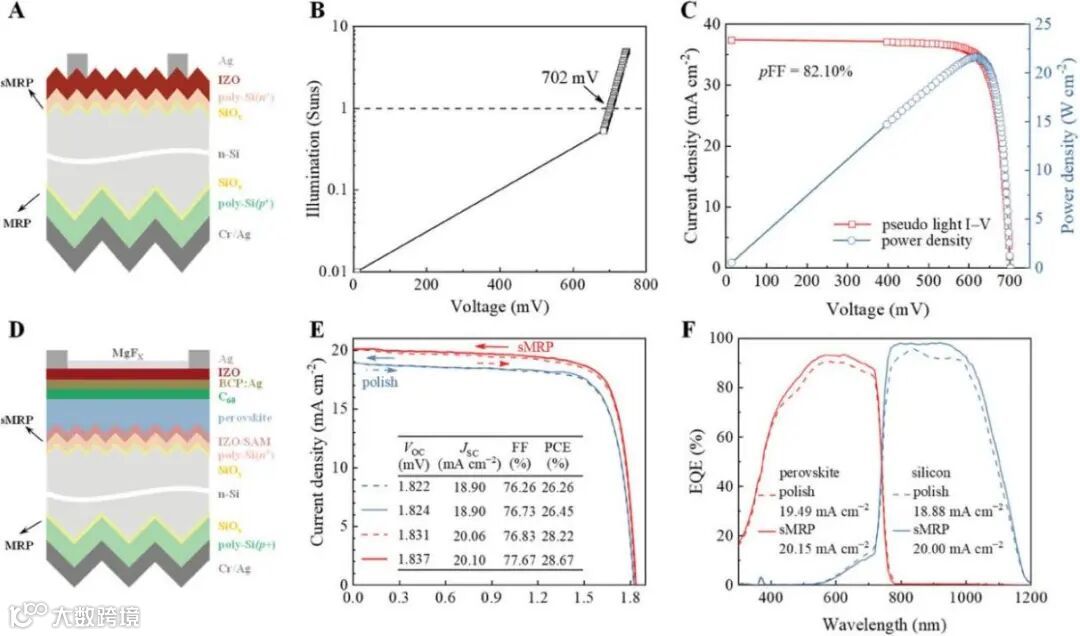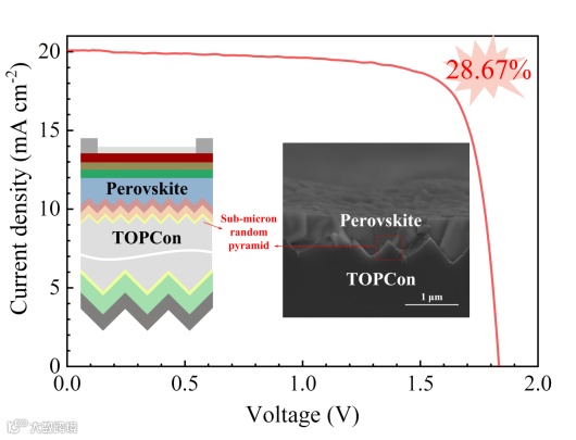 图1. 基于亚微米金字塔的钙钛矿/TOPCon叠层太阳电池J-V曲线与结构示意图