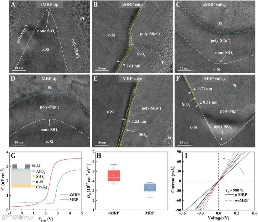 高温退火虽然会导致金字塔的谷底和塔尖出现SiOx区域变薄甚至消失,形成类似“针孔”结构,导致SiOx薄膜的化学钝化质量降低,但是掺杂原子可通过“针孔”区域实现更深的内扩散,增强局部场效应钝化从而弥补化学钝化的下降。此外,“针孔”的存在可以有效的增强载流子的传输能力,降低TOPCon的接触电阻率。