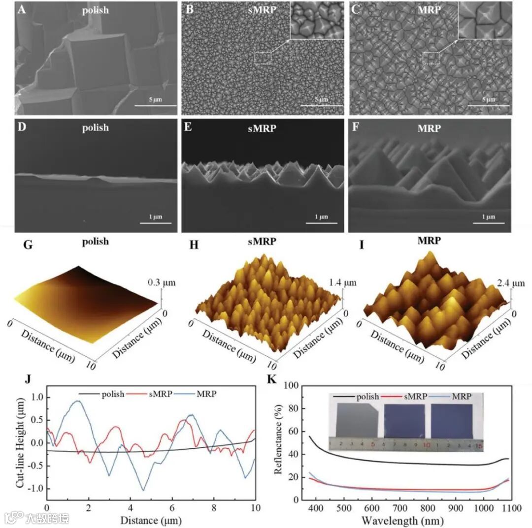 通过对比平面、小绒面、大绒面的形貌结构,发现金字塔高度在0.6-0.8 μm时,其反射率可以与微米级金字塔绒面相媲美,有着优异的陷光性能,且亚微米金字塔尺寸分布均匀。