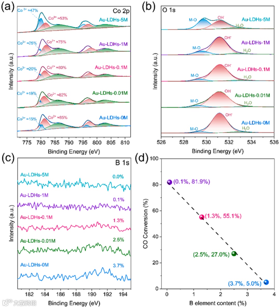 Fig. 4. Au-LDHs-xM的高分辨率XPS光谱。(a) Co 2p;(b) O1s;(c) B 1 s和(d)的CO转换作为Au-LDHs-xM的B元素含量的函数。