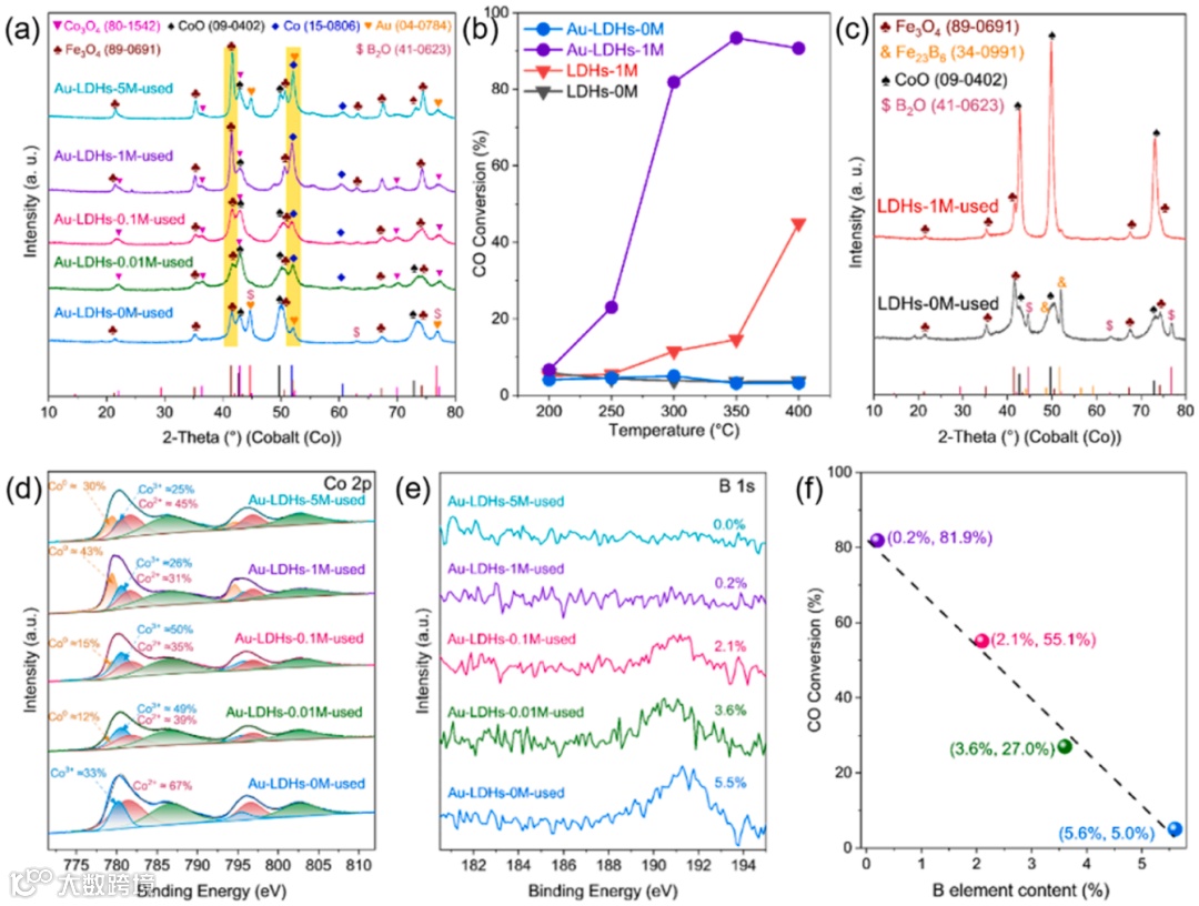 Fig.7.(a) Au-LDHs-xM-used的XRD图谱,(b) Au-LDHs-xM和LDHs-xM的CO转化率随温度的变化,(c) LDHs-xM-used的XRD图谱;Au-LDHs-xM-used的 (d) Co 2p和 (e) B 1s的高分辨XPS谱和 (f) CO转化率随Au-LDHs-xM-used中B元素含量的变化