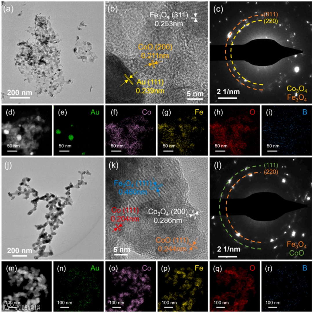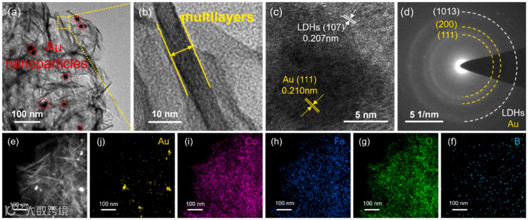 如图5a,b和e所示,Au-LDHs-0M显示出典型的LDHs褶皱多层状结构。随着碱浓度的增加,从Au-LDHs-0.01 M到Au-LDHs-1M,LDHs褶皱的层状结构逐渐消失,同时可以观察到小颗粒覆盖的纳米片。特别是对于Au-LDHs-1M,如图6b所示,剥离的LDHs纳米片的厚度只有2 nm,接近于单层或少层。此外,Au-LDHs-0M显示出明显的大Au纳米颗粒(约16nm)。相比之下,碱处理的Au-LDHs-xM中的黑色纳米颗粒应该归因于Co3O4物种而不是Au纳米颗粒。具体原因如下:元素mapping的线扫描显示Au元素的强度很弱,而Co和O元素非常强(图6c)。碱处理的Au-LDHs-xM的SAED图谱和HRTEM图像也证实了Co3O4物种的存在。这些结果与XRD和XPS的结论一致。如图5e-j和6d-i所示,映射图像证实了Fe,Co,O和B元素的均匀分散。