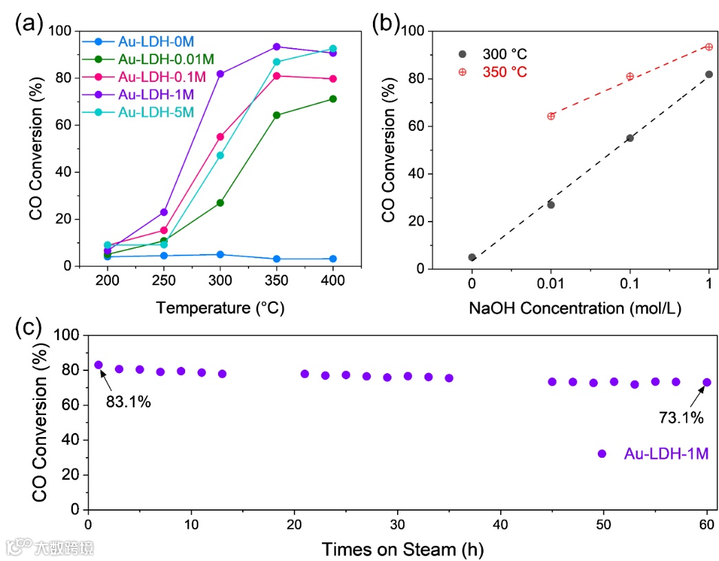 与未经碱处理的非活性LDH基催化剂相比,适度的碱处理显著提升了Au-LDH催化剂的WGS活性。Au-LDH-xM催化剂的CO转化率顺序为:Au-LDH-1M > Au-LDH-5M ≈ Au-LDH-0.1M>Au-LDH-0.01M≫Au-LDH-0M。令人印象深刻的是,如图2b所示,CO转化率与碱浓度( 0M ~ 1M)具有很好的正相关性。这些结果表明,WGS活性随着碱浓度( 从0到1M )的升高而逐渐升高,但在5M时又有所下降。此外,如图2c所示,在300 °C时,Au-LDH-1M的CO转化率仅下降了10 % ( 60 h ,从83.1 %下降到73.1 %),表现出更优异甚至更高的稳定性。