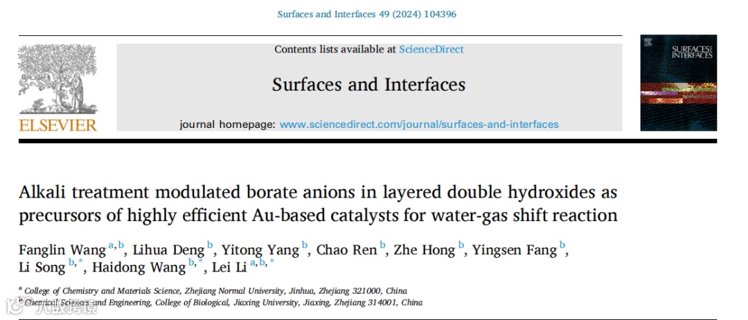 基于此,嘉兴大学的李雷教授课题组在国际知名期刊Surfaces and Interfaces上发表题为“Intercalated Borate Anions Modulation of Layered Double Hydroxide by Alkali Treating for Improving Water-gas Shift Catalytic Performance of Au-based Catalysts”的研究文章。该研究文章通过在室温下以NaBH4为沉淀剂合成了CoFe-LDHs(简称LDHs)。通过温和的碱处理调控LDHs中插层BO33−阴离子以提高Au基催化剂的WGS性能。研究结果表明,适度的碱处理消耗了层间BO33−阴离子,大幅提升了Au-LDHs催化剂的WGS活性。在不同的碱处理浓度中,1M NaOH处理的Au-LDHs-1M表现出最高的WGS活性和优异的稳定性,在60 h的活性测试中活性仅下降10 %。通过XRD,TEM和XPS等表征进一步证明适当的碱处理促进了LDHs剥离成有Co3O4纳米颗粒覆盖的纳米片,这有利于Au颗粒的高度分散同时也更容易转化为活性Fe3O4和金属Co相。而Au-LDHs-5M中因LDHs结构变化导致Au颗粒较大,进而活性较低。此外,Au-LDHs-0M在WGS反应中原位形成B2O和Fe23B6毒物相而失活。