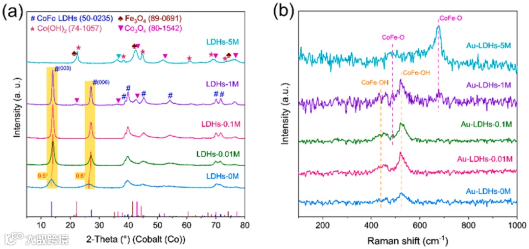 X射线衍射(XRD)图谱(图3a)表明成功合成了LDH(标记为“#” , JCPDF No.50- 0235)。在合成过程中,NaBH4会水解(NaBH4+ 4H2O→NaOH + H3BO3 + 4H2),Co2+和Fe3+可以与OH−结合形成CoFe-LDH,副产物BO33−作为插层阴离子留在LDH层间。经过0.01 ~ 1 M NaOH碱处理后,除(003)和(006)峰向高角度偏移约0.5 ~ 0.6° 外(图2a中的黄色区域),LDH的特征衍射峰仍然得以保持,这可能是碱处理过程中插层阴离子BO33−的反应消耗所致。同时,逐渐出现新的Co3O4 (标记为“▼”,JCPDF No.80- 1542)衍射峰,尤其是LDH-5M。此外,LDH-5M中LDH的特征衍射峰完全消失,生成了新的Co(OH)2(标记为“★”, JCPDF No.74 - 1057)和Fe3O4(标记为“♣” , JCPDF No.89-0691)衍射峰。对于图3b中的拉曼光谱,Au-LDH-0M有两个以451和522 cm-1为中心的谱带,归属于CoFe-OH的震动模式。碱处理后的Au-LDH-xM (x = 0.01 ~ 1)的两个谱带的强度明显增加,这应该是由于碱处理增强了的XRD峰的强度。同时,Au-LDH-1M在488和676 cm -1处出现了两个新的谱带,表明形成了属于Co3O4和Fe3O4的CoFe-O谱带。Au-LDH-5M具有较强的Co3O4和Fe3O4拉曼谱带。上述XRD和Raman结果表明,碱处理可以温和地改变LDH的结构,但是在高浓度碱作用下也会破坏LDH的结构。