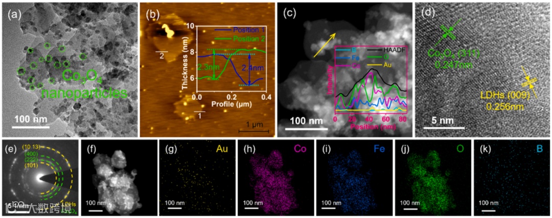 Fig. 6. Au-LDHs-1M的透射电镜(a) TEM,Co3O4颗粒:绿色虚线圈;(b) AFM图像和高度剖面;(c) HAADF TEM和线扫描剖面;(d) HRTEM;(e)选择区域电子衍射(SAED);(f-k)mapping