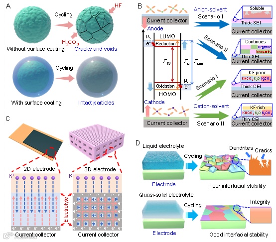 从材料设计的角度出发优化电化学性能是钾离子混合电容器的主要改性方法之一。表面包覆和异相原子掺杂作为目前常用的材料改性手段,其作用机制和适用性仍存在较大争议。针对钾离子混合电容器的正负极“界面设计”+“配位环境优化”可以有效提高电极/电解液之间的兼容性和传输动力学。不同于传统的2D结构电极,具有开放式结构的3D电极可以提高传质效率并且抑制不可逆的体积膨胀。发展高效安全的预钾化策略能够有效提高钾离子混合电容器的库伦效率和循环寿命。全/准固态电解质在钾离子混合电容器中可以显著提升器件整体的能量密度,但是其存在钾离子导率较低,界面电阻较大等缺陷亟待解决。