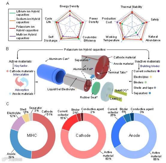 图1. 不同种类混合电容器的性能对比、结构和组成单元
