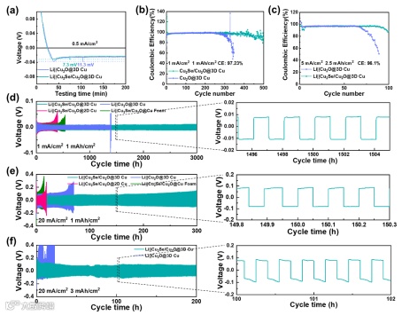 在优化的孔结构及异质结构纳米线的协同作用下,Cu2Se/Cu2O@3D Cu展示出优异的电化学性能,在1 mA/cm2与1 mAh/cm2的半电池测试下能稳定循环500圈,平均库伦效率为97.23%,在1 mA/cm2与1 mAh/cm2的对称电池测试中具有3000小时的超长寿命,即使在20 mA/cm2与3 mAh/cm2的极端测试条件下也能稳定循环300小时。