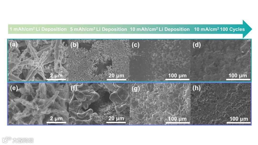 图5. Cu2Se/Cu2O@3D Cu与Cu2O@3D Cu的锂沉积行为表征。(a-c)Cu2Se/Cu2O@3D Cu,(e-f)Cu2O@3D Cu沉积(a,e)1 mAh/cm2,(b,f)5 mAh/cm2,(c,g)10 mAh/cm2后的SEM照片。(d)Cu2Se/Cu2O@3D Cu,(h)Cu2O@3D Cu预沉积10 mAh/cm2锂并在10 mA/cm2下循环100圈后的SEM照片。