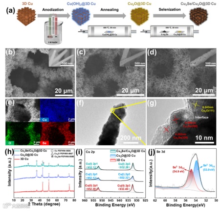 图2. (a)3D Cu的表面修饰流程。(b)Cu(OH)2@3D Cu,(c)Cu2O@3D Cu, (d)Cu2Se/Cu2O@3D Cu的低倍与高倍SEM照片。(e)Cu2Se/Cu2O@3D Cu的EDS Mapping照片。Cu2Se/Cu2O纳米线的(f)低倍,(g)高倍TEM照片。(h)3D Cu,Cu2O@3D Cu和Cu2Se/Cu2O@3D Cu的XRD。(i)3D Cu,Cu2O@3D Cu和Cu2Se/Cu2O@3D Cu的Cu 2p轨道的XPS。(j)Cu2Se/Cu2O@3D Cu的Se 3d轨道的XPS。