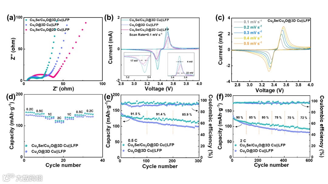 图6. (a)Cu2Se/Cu2O@3D Cu||LFP,Cu2O@3D Cu||LFP与Cu2Se/Cu2O@2D Cu||LFP的EIS。(b)Cu2Se/Cu2O@3D Cu||LFP,Cu2O@3D Cu||LFP与Cu2Se/Cu2O@2D Cu||LFP在0.1 mV扫速下的CV曲线。(c)Cu2Se/Cu2O@3D Cu||LFP在不同扫速下的CV曲线。Cu2Se/Cu2O@3D Cu||LFP与Cu2O@3D Cu||LFP在(d)0.2 C-2 C,(e)0.5 C,(f)2 C下的循环测试。
