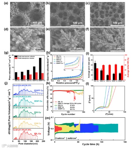 图1. 五种三维多孔铜的形貌表征、孔结构参数表征及电化学性能测试。(a)3DL Cu,(b)3DM Cu,(c)3DS Cu的低倍SEM照片,(d)3DS Cu,(e)3DSF Cu,(f)3DSFF Cu的高倍SEM照片,(g)介孔与大孔孔容分析,(h)氮气等温吸脱附曲线,(i)表面孔径统计及首圈库伦效率,(j)孔分布曲线,(k)库伦效率测试,(l)EIS测试,(m)对称电池测试。
